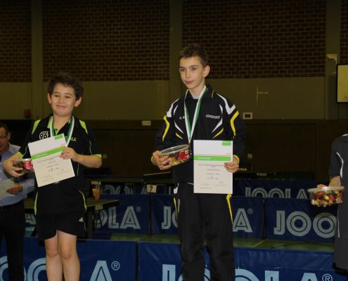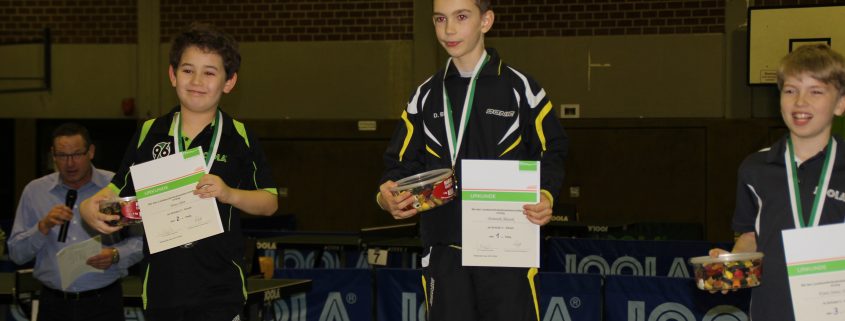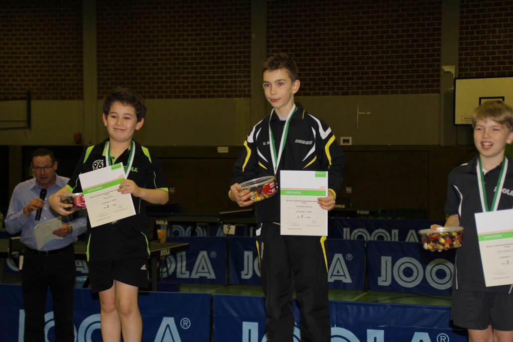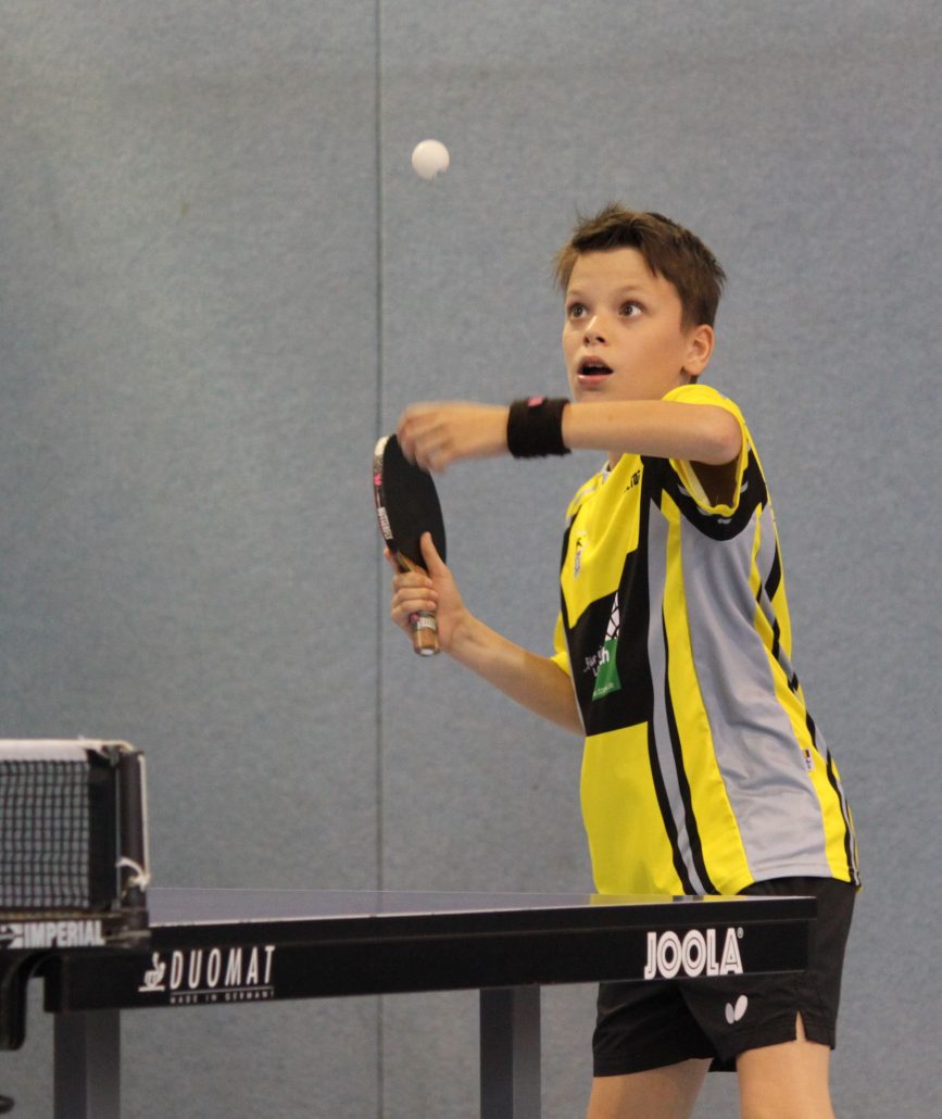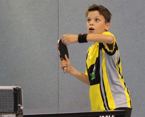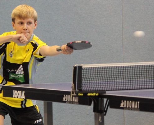 Auch bei den Schülern A gab es Licht und Schatten. Deutlich mehr ausgerechnet hatte sich Ziesler, der allerdings erkältungstechnisch nicht 100% fit und sein Einsatz am Freitag sogar noch mit einem Fragezeichen versehen war. So sprang nur eine knappe Niederlage gegen David König (Hannover 96, 11:13 im Entscheidungssatz) heraus. Felix Rösch zog mit zwei 5-Satz-Siegen über Jonathan Aretz (SV Sandkamp) und Julian Recker (Blau-Weiß Hollage) ebenso ins Achtelfinale ein wie Lennard Kruschewski, der gegen Leon Schmidt (Torpedo Göttingen) und Ricardo Klostermann (BSV Holzhausen) erfolgreich war. Hier kam allerdings auch für die beiden das Aus. Rösch traf direkt auf den späteren Landesmeister Bjarne Kreißl (Torpedo Göttingen) und konnte den Oberligaakteur nur zeitweise fordern. Kruschewski zeigte ein starkes Spiel gegen Malte Wibbing (TV Stuhr) und konnte sogar mit 2:1 in Führung gehen. Doch in den letzten beiden Sätzen spielte er zu zögerlich und sein Gegner nur deutlich klüger und mutiger als noch zuvor. Mit 4:11 und 6:11 gingen nun auch die Sätze 4 und 5 und damit das gesamte Spiel weg.