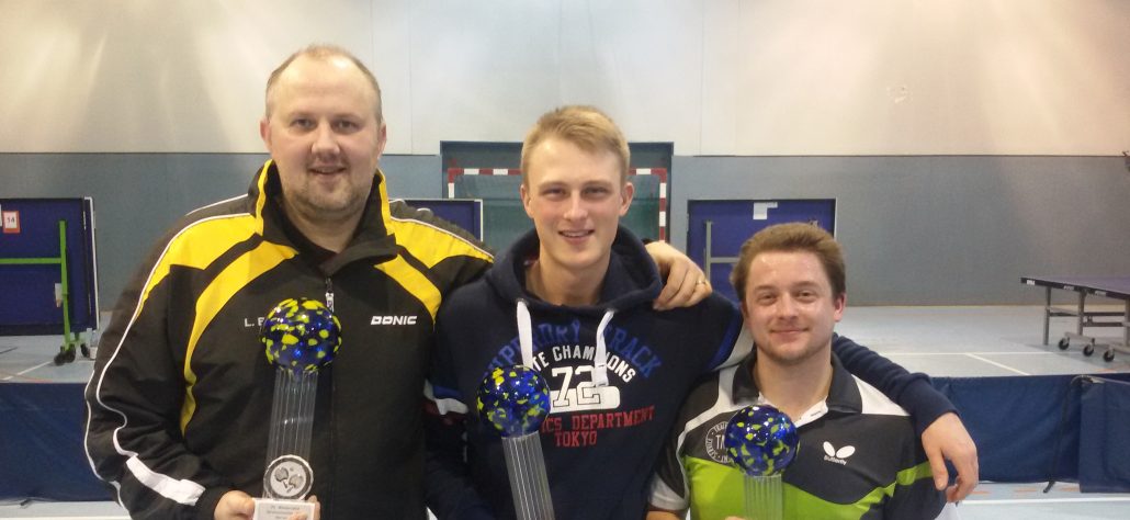 Auch in der A-Klasse gab es wenig Überraschungen. Die Spieler der 1.Herren mit Lukas Brinkop (3:0 über Lennart Winkler), Christoph Bruns (3:1 über Max Palett) und Andres Oetken (3:0 über Marco Stoll) zogen ins Halbfinale ein. Dabei verpasste Palett eine bessere Setzung durch die Niederlage gegen Carolin Oelker in der Gruppenphase. Doch sie konnte ihren Vorteil nicht nutzen und unterlag im Viertelfinale Tim Dümeland mit 0:3. Ind en Halbfinals setzte sich Brinkop mit 3:0 gegen Dümeland durch, während es beim Spiel Bruns gegen Oetken eng und umkämpft herging. Bruns führte bereitsmit 2:1 und 8:3, musste aber am Ende doch Oetken zum Sieg gratulieren. Im Finale konnte sich dann der Mannschaftsführer gegen die neue Nummer 2 mit 3:1 behaupten und schaffte wie bereits Blanke vorher das Triple.