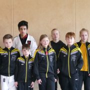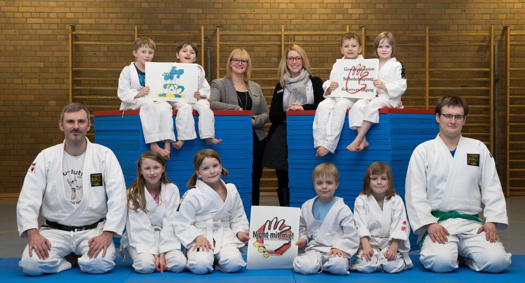 Die jüngsten Sportler der Ju-Jutsu-Sparte und ihre Trainer, Matthias Binneböse und Philip Lindner, bedankten sich bei allen Unterstützern im Rahmen der Übergabe der Matten stellvertretend bei Myriam Langer und Wibke Schmid von der Sparkasse Westercelle.