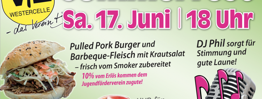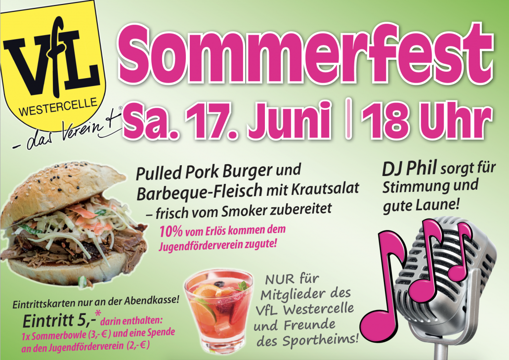 Für alle Mitglieder des VfL Westercelle und Freunde des Sportheims findet am Sa. 17.06. ab 18 Uhr das jährliche Sommerfest statt. Unser Vereinswirt Ralf Krüger freut sich über Ihr Erscheinen.