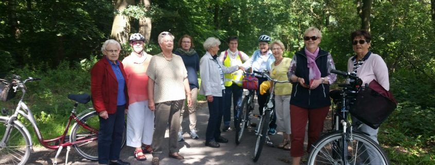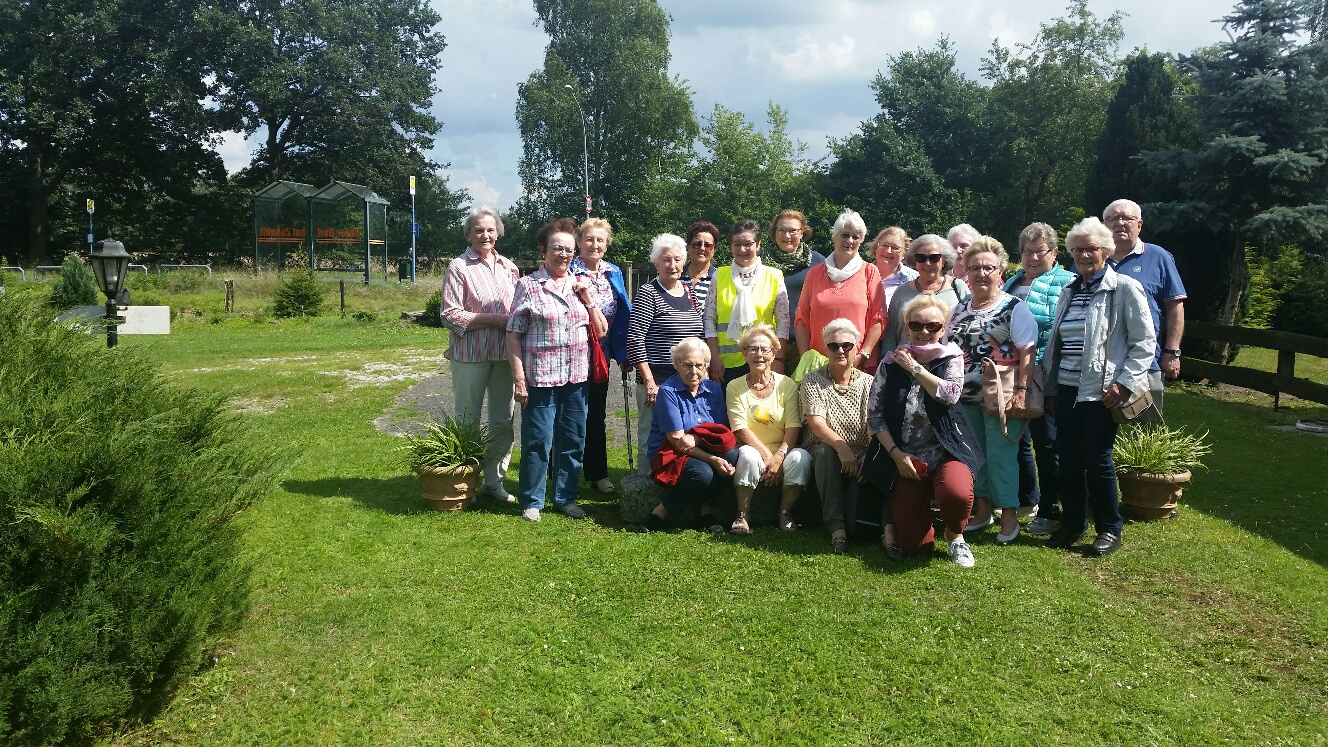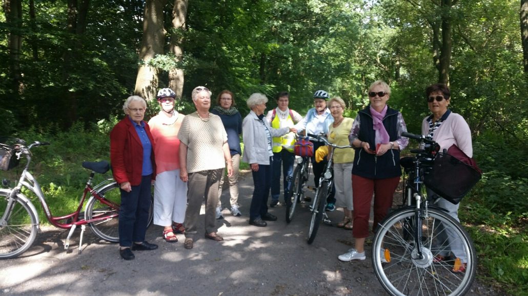 Am 28.07.17 treffen sich die Gymnastik – und Gehirnjogginggruppen mit Inge Dahms zu einer Fahrt nach Großmoor zum Kaffeetrinken in den Kuhstall. Von den 20 Teilnehmern treten 11 Personen in die Pedale, der Rest bildet eine Fahrgemeinschaft. Bei gutem Kaffee, Tee und Kuchen wird wieder ausgiebig laut und Kräftig geklönt. Fröhlich und gestärkt fahren wir nun zurück. Mit dicken dunklen Wolken im Nacken treten wir mächtig in die Pedale. Unterwegs erwischt uns dann doch ein prasselnder Regenschauer. Mit Regenjacke und Kapuze erreichen wir das Buswartehäuschen am Wittekop. – Und schwupp di wupp ist auch der Regenschauer vorbei.