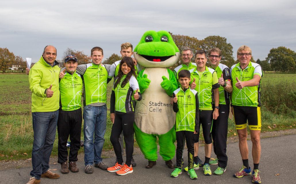 Im Rahmen der 2.Offenen Vereinsmeisterschaft im „Duathlon-Sprint um Zwölf“ war die Freude groß, denn der Geschäftsführer der Stadtwerke Celle GmbH, Herr Thomas Edathy, überreichte den Sportlern des VfL Westercelle ergänzend weitere auffallend hübsche Wettkampfbekleidung (v.l.n.r. auf dem Foto: Thomas Edathy, Thorsten Lübke, Thomas Beckmann, Nadia Schreiber, Paul Andrä, Fiete, Fabian Schreiber, David Simmons, Frank Schreiber, Volker Dittmar und Gerald Sommer).