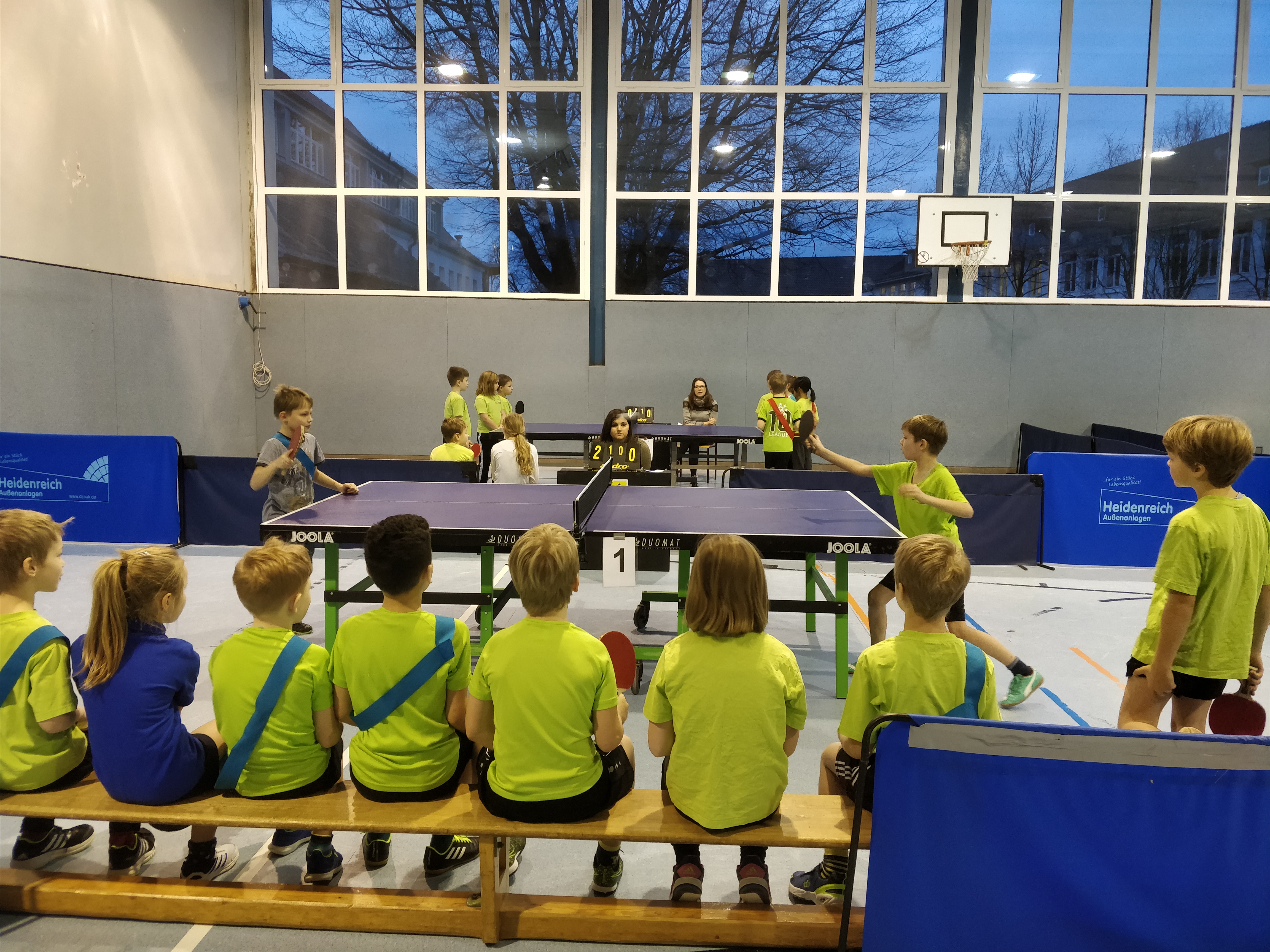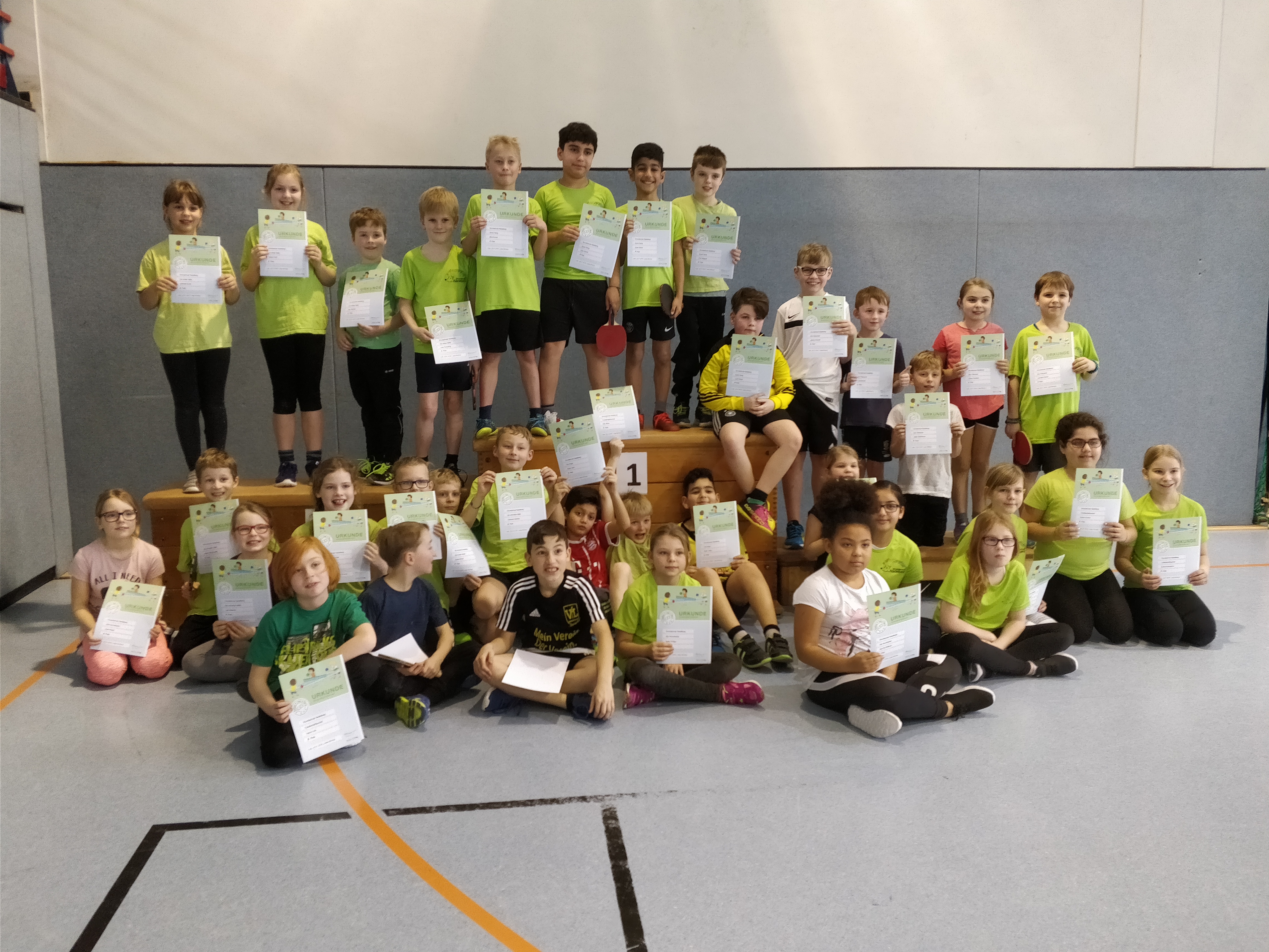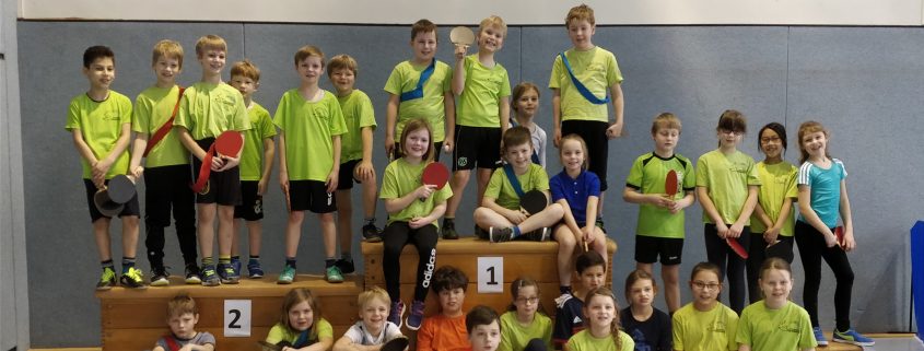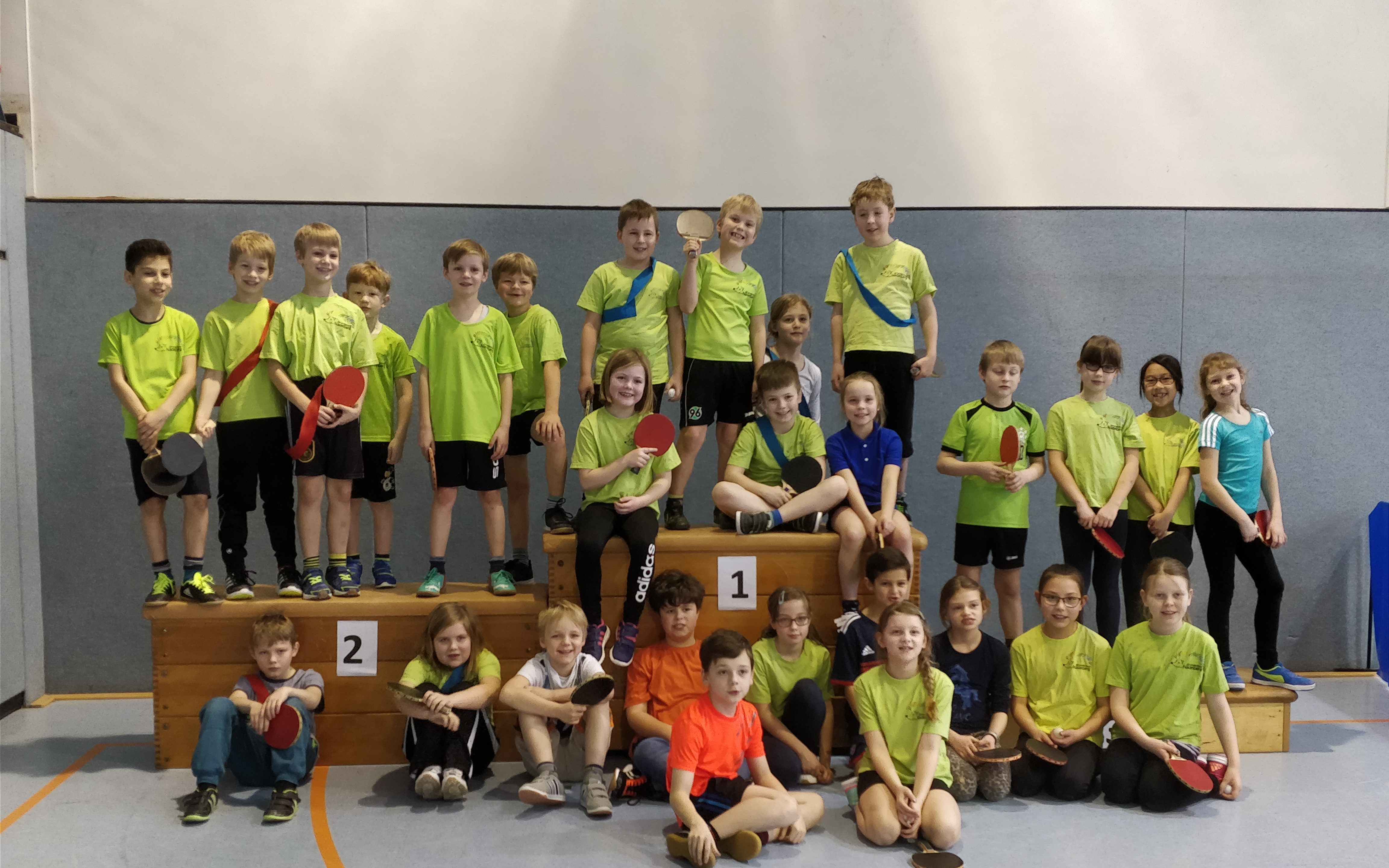 An der Grundschule Nadelberg ging es heute an die Tische. In den ersten beiden Schulstunden griffen die Schülerinnen und Schüler der Klassenstufe 3 zu den Schlägern. Zunächst wurde dabei klassenintern gespielt. In der 3a setzte sich „Das Ghettofaustteam“ gegen „Die 4 Tischtennisschläger“ und „Die bunten Federn“ durch. In der 3b konnten alle Teams einen Sieg einfahren und so mussten die Sätze entscheiden. Den Gruppensieg holten sich „Die Karatekaninchen“ vor „Die Feuerbälle“ und „Die 5 Totenköpfe“. Die Endrundenspiele waren dann allesamt klare Angelegenheiten. Platz 3 erkämpften sich „Die Karatekaninchen“ und Vizeschulmeister wurden „Die 4 Tischtennisschläger“. Den Gesamtsieg holte sich „Das Ghettofaustteam“ mit Milena Leifheit, Natalie Röder, Emil Wietfeld, Leo Schäfer und Jonas Zeitzmann. Mit dem Sieg gewannen sie auch noch 4 Schläger und Bälle für ihre Klasse und erhielten die Siegershirts. Leer ging kein Kind nach Hause, denn eine Urkunde gab es für alle.