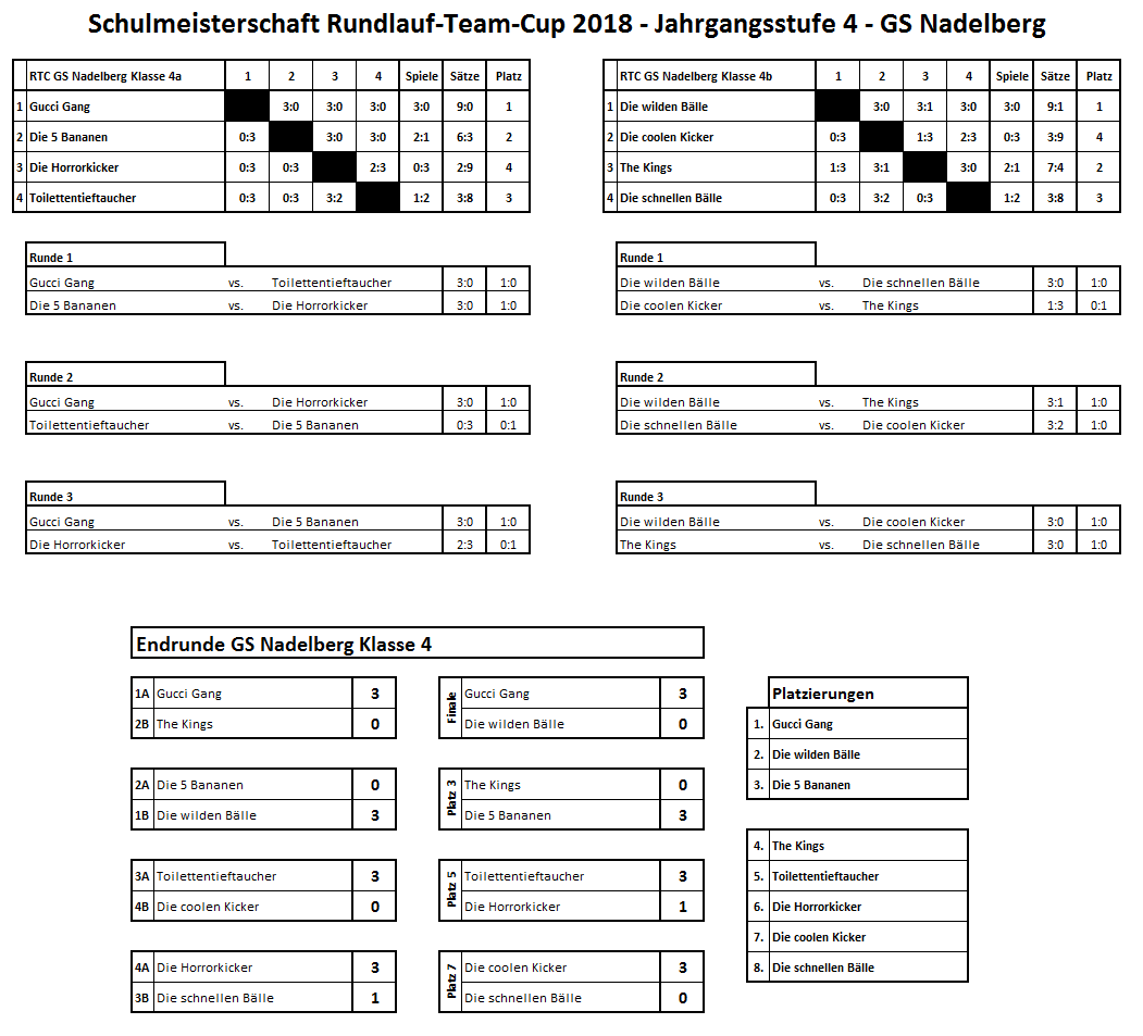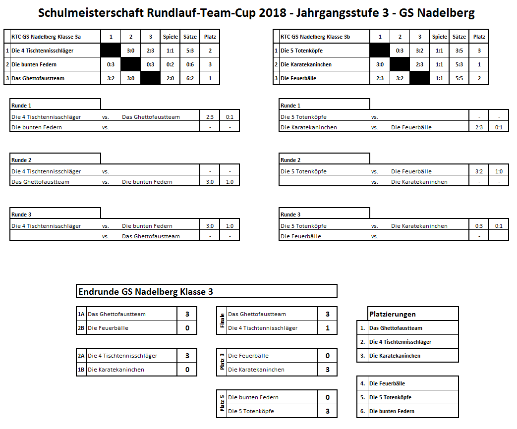 Es ist wieder soweit: Für viele Schülerinnen und Schüler der dritten und vierten Klasse der Celler Grundschulen steht wieder Tischtennis an, genauer der Rundlauf-Team-Cup (RTC). Der RTC wurde vom Tischtennisverband Niedersachsen ins Leben gerufen um Kindern im Grundschulalter den Spaß an dieser Sportart zu vermitteln. Dabei wird der klassische Rundlauf kombiniert mit dem Teamcharakter. 2 Teams bestehend aus 4 oder 5 Personen stehen sich dabei gegenüber. Wer einen Fehler begeht, scheidet aus. Ist nur noch ein Team übrig, erhält es einen Satz. Stehen sich am Ende zwei Spieler aus unterschiedlichen Mannschaften gegenüber, so gibt es ein Finale bis 5 Punkte. Der Sieger erhält ebenfalls einen Satz für sein Team. Die Mannschaft, die zuerst 3 Sätze erspielen kann, gewinnt dann diese Begegnung. Der Sieger der 3.Klasse und der des 4.Jahrgangs vertreten dann ihre Schule bei der Regionalmeisterschaft und Spielen dort um den Hauptgewinn: Einen Tischtennis-Mini-Tisch, auf dessen Oberfläche das Foto des Teams abgedruckt wird.