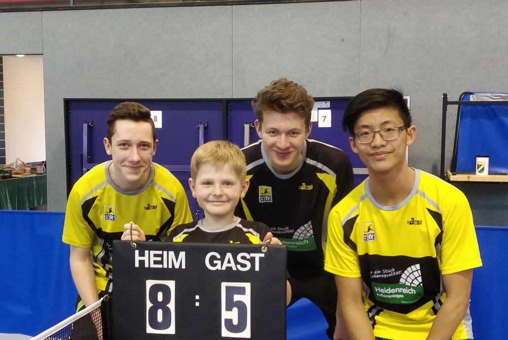 Zusammen mit Chek-Hien Loi führten sie 9:4 im ersten Satz, vermochten diesen aber nicht zuzumachen. Am Ende stand eine 1:3-Niederlage zu Buche. Nach den Doppeln und den ersten 3 Einzeln stand es 2:3 und unser 8jähriger „Tor“ durfte zum ersten Einzel an den Tisch. Nach verlorenem 1.Satz steigerte sich Rakete in den nächsten Sätzen und verwandelte seinen 1.Matchball zum 12:10 im 4.Satz – Wahnsinn! Fabian Witt, Dominik und Chek-Hien erhöhten auf 6:3 und Enno machte da weiter, wo er aufgehört hatte. Gegen den mit kurzen Noppen unangenehm agierenden Julian Bannach holte er sich Satz 1. In den weiteren Sätzen merkte man Enno aber den Altersunterschied an. Aber Fabian und Dominik konnten trotz der weiteren Niederlage von Chek-Hien den 8:5-Sieg perfekt machen.