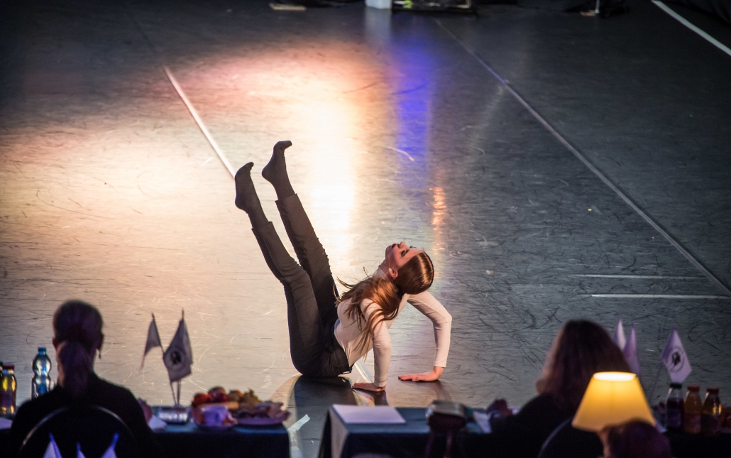 Diana stand mit ihrem Solo „You sleep“ auf der Fläche. Der Name war hier Programm und sie startete mit geschlossenen Augen und tanzte den ersten Teil ihrer Choreografie blind. Im weitern Verlauf des Stückes erhöhte sie den Schwierigkeitsgrad immer mehr und ihre Sprünge und Drehungen wurden immer schwieriger.