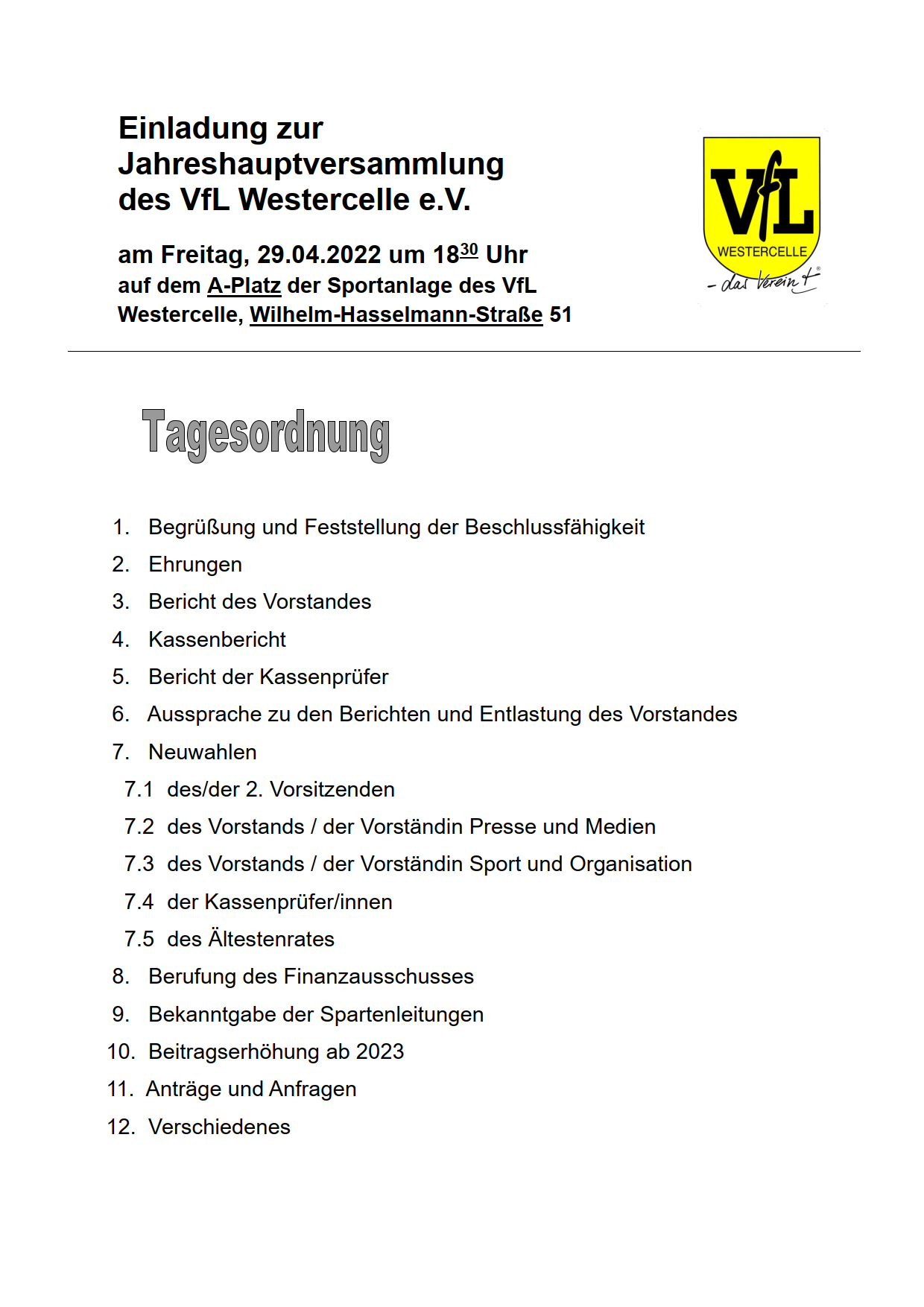 Die Versammlung findet statt am Freitag, 29. April 2022 um 18.30 Uhr auf dem A-Platz der Sportanlage des VfL Westercelle.