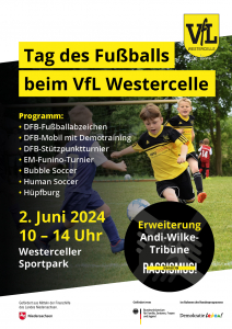 Nachdem Bundestrainer Julian Nagelsmann den Kader der deutschen Fußball-Nationalmannschaft bekannt gegeben hat, sind viele Fußball-Fans im Land bereits im EM-Fieber – am 14. Juni eröffnet das DFB-Team die Heim-EM. Erstmals nach der EM 1988 und dem WM-Sommermärchen 2006 ist Deutschland wieder Ausrichter eines großen Turniers. Um für noch mehr Begeisterung beim Fußball-Nachwuchs zu sorgen, veranstaltet der VfL Westercelle nun am Sonntag, 2. Juni, 10 bis 14 Uhr, einen Tag des Fußballs im Westerceller Sportpark. Insbesondere für Kinder und Jugendliche wird ein buntes Programm geboten, aber auch eine Trainerschulung und ein Turnier der DFB-Stützpunkte sind Teil der Veranstaltung.