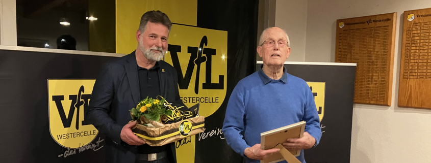 Der Ehrungen gab es natürlich viele: So gab es für Anke Blank, Claudia Büchler-Jucks, Joachim Ehlers, Margrit Fröhlich und Agnes Jorns Urkunden und Präsente für 25-jährige Mitgliedschaft. Brigitte Alber-Oberbeck, Olaf Beck, Marion Both, Hans-Eckardt Ehrenthal, Roswitha und Manfred Geisler, Erich Körner und Werner Kuhls erhielten Auszeichnungen für 40 Jahre Vereinszugehörigkeit. Lothar Koslowski, früher aktiver Fußballer, später Dauerfan und Sponsor der Fußballabteilung, nahm mit dem ehemaligen Leiter der Tanzabteilung Horst Koch die Glückwünsche des Vorsitzenden für 60jährige Vereinszugehörigkeit entgegen. Das VfL-Urgestein und älteste lebende VfL-Mitglied Hannskarl Rauterberg hatte als ehemaliger langjähriger Vorsitzender in den letzten Jahren alle erdenklichen Ehrungen wie Goldene Ehrennadel, Ehrenmitgliedschaft und vereinsübergreifend das Bundesverdienstkreuz erhalten. Unter tosendem Applaus wurde ihm deshalb für 75-jährige Mitgliedschaft ein besonderes Präsent des Vorstandes überreicht.