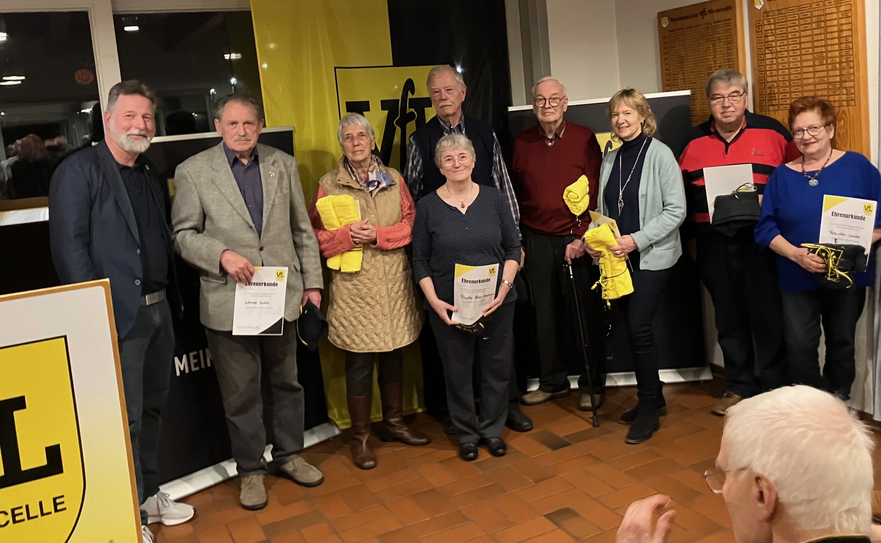 Der Ehrungen gab es natürlich viele: So gab es für Anke Blank, Claudia Büchler-Jucks, Joachim Ehlers, Margrit Fröhlich und Agnes Jorns Urkunden und Präsente für 25-jährige Mitgliedschaft. Brigitte Alber-Oberbeck, Olaf Beck, Marion Both, Hans-Eckardt Ehrenthal, Roswitha und Manfred Geisler, Erich Körner und Werner Kuhls erhielten Auszeichnungen für 40 Jahre Vereinszugehörigkeit. Lothar Koslowski, früher aktiver Fußballer, später Dauerfan und Sponsor der Fußballabteilung, nahm mit dem ehemaligen Leiter der Tanzabteilung Horst Koch die Glückwünsche des Vorsitzenden für 60jährige Vereinszugehörigkeit entgegen. Das VfL-Urgestein und älteste lebende VfL-Mitglied Hannskarl Rauterberg hatte als ehemaliger langjähriger Vorsitzender in den letzten Jahren alle erdenklichen Ehrungen wie Goldene Ehrennadel, Ehrenmitgliedschaft und vereinsübergreifend das Bundesverdienstkreuz erhalten. Unter tosendem Applaus wurde ihm deshalb für 75-jährige Mitgliedschaft ein besonderes Präsent des Vorstandes überreicht.
