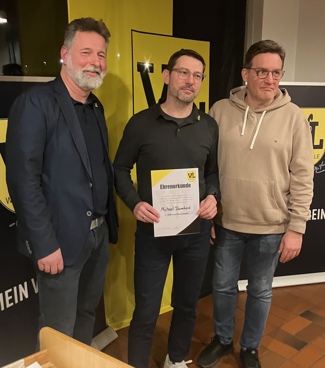 - Michael Dümeland wird mit der Silbernen Ehrennadel für jahrelanges Engagement als Trainer und Abteilungsleiter Handball geehrt. Links der 1. Vorsitzende Harald Nowatschin, rechts sein Stellvertreter Heiko Vollmer