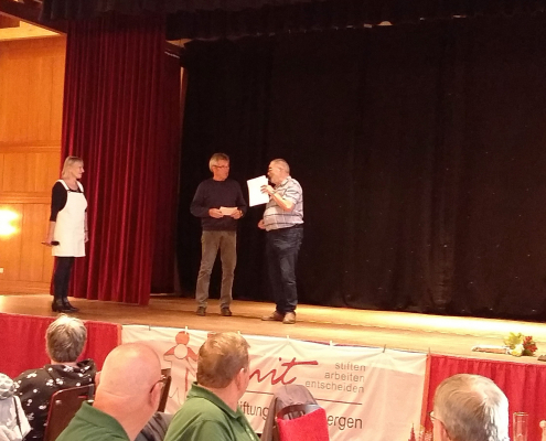 Im Stadthaus Bergen kam am 8.10.22 eine verblüffende Zahl von Boule-Spielerinnen und Boule-Spielern aus dem ganzen Landkreis Celle zusammen – insgesamt waren es wohl weit über 100 Menschen. Dieser von der Bürgerstiftung Bergen veranstalteten Zusammenkunft bei Buffett und natürlich Wein (und auch Bier) gingen 110 Spiele voraus, die in einem Zeitraum von vier Monaten (13.5. – 9.9.22) die Team-Rangliste des Landkreises ausspielten. 11 Mannschaften mit mehr oder weniger originellen Namen beteiligten sich an diesem von dem Bergener Boule-Papst Conny van der Borst initiierten und organisierten Wettkampf: Bürgerstiftung Bergen, Hermannsburg Blau und Hermannsburg Gelb, Eversen IV und Eversen V, Boule Bergen und Boule Lohheide, Frauenpower Eversen, Bleckmar, Celle F.G (Französischer Garten) und das Boule-Team des Vfl Westercelle.  Im Modus „Jeder gegen jeden“ wurden jeweils zwei Doubletten (Zwei gegen Zwei mit je drei Kugeln) und eine Triplette (Drei gegen Drei mit je zwei Kugeln) gespielt. Geboult wurde auf den Bahnen in Bergen, Eversen, Loheide, Hermannsburg und auf der Anlage des VfL.