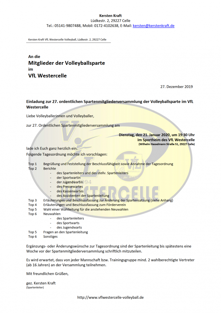 27. ordentlichen Spartenmitgliederversammlung der Volleyballsparte im VfL Westercelle