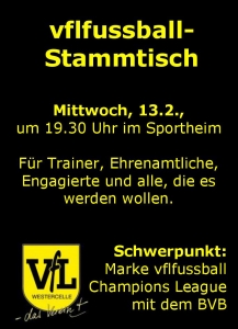 Am Mittwoch, den 13. Februar, trifft sich um 19:30 Uhr der Stammtisch im Sportheim Westercelle, um sich über verschiedene Themen rund um den Fußball und den VfL auszutauschen und zu fachsimpeln. Für die Premiere stehen die Marke vflfussball sowie das Champions League Achtelfinale Tottenham – Dortmund auf dem Programm.