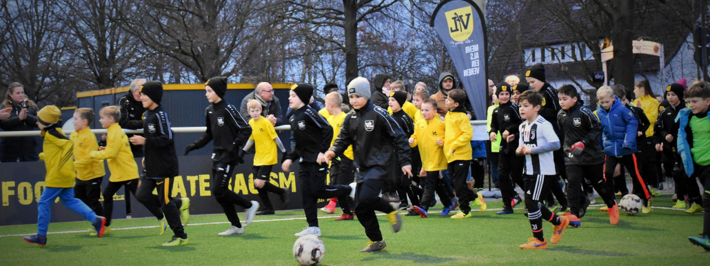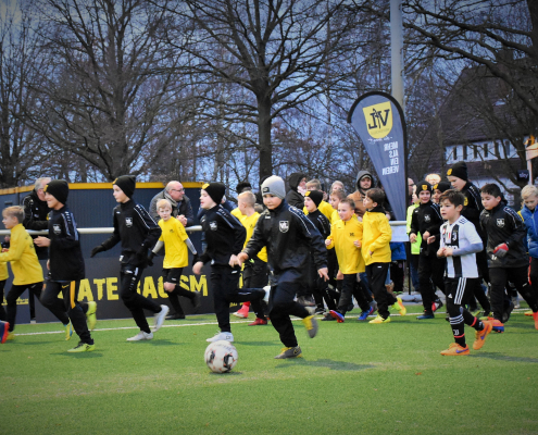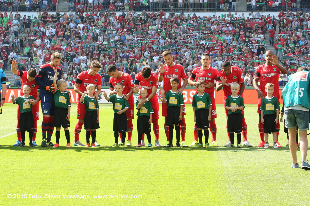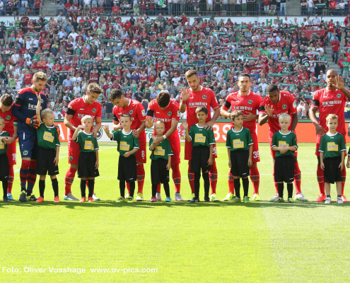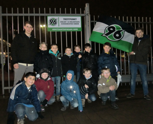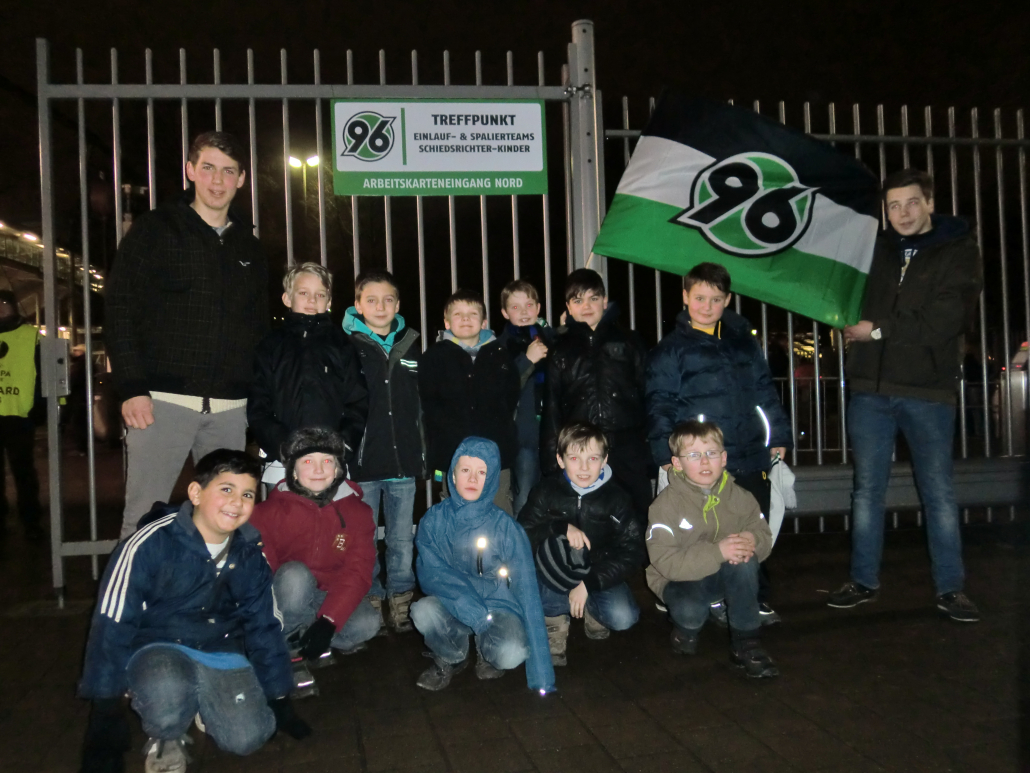 Die U8-Kicker (Jahrgang 2008, Trainer Christopher Menge, Leon Gierendt und Hendrik Herrmann) laufen beim Bundesliga-Spiel Hannover 96 gegen Bayer Leverkusen mit auf.