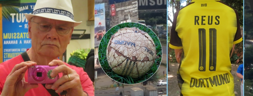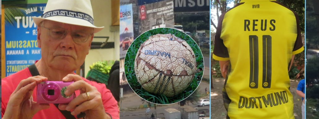 Dabei hat er natürlich die Kamera, um die interessantesten und eindrucksvollsten Momente festzuhalten. Neben dem ‚Nyayo National Stadium‘ im Hintergrund gibt es auch hier viele Fans des Bundesliga-Fußballs. Wie den 12-jährige Ben, der natürlich auch selber Fußball spielt – allerdings nicht mit solch einem Ball wie auf dem Foto; damit spielen die Kinder auf den kargen Bolzplätzen neben den Straßen.