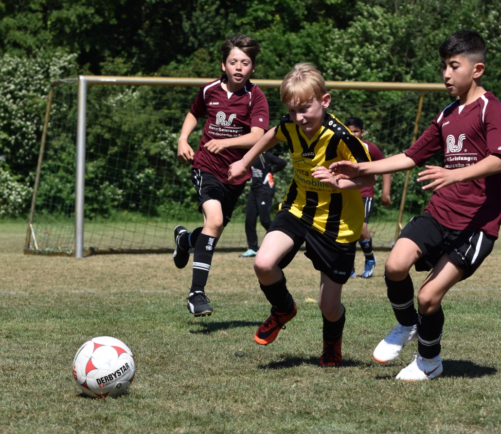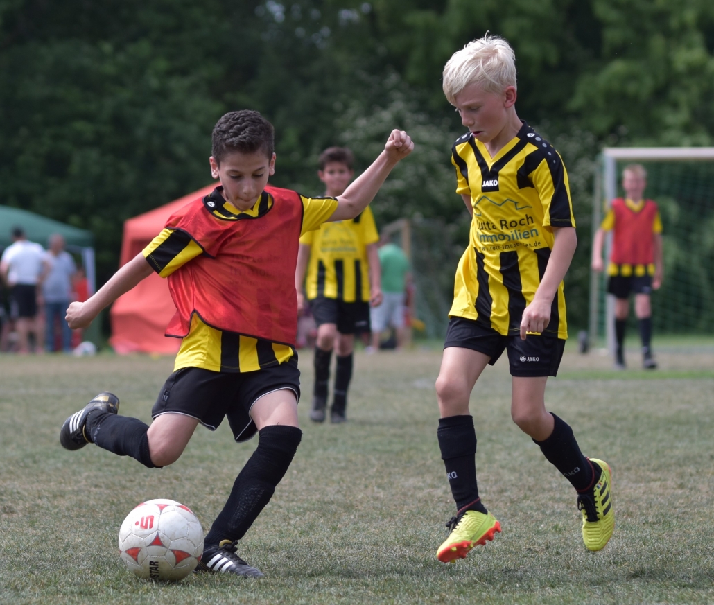 64 Mannschaften aus vier verschiedenen Altersgruppen trotzten am Samstag und Sonntag den hohen Temperaturen und wetteiferten in besonders ausgeglichenen Partien um die begehrten Pokale. Dabei kam in diesem Jahr ein etwas anderer Turniermodus zum Tragen: „Wir haben es so gemacht, wie es früher war.“, erklärte Organisator Sebastian Paschke. „Normalerweise haben wir immer Turniere von der U6 bis zur U13 ausgespielt, dieses Mal wurden jeweils zwei Altersklassen wieder zur klassischen G-, F-, E- oder D-Jugend zusammengefasst.“ Eigentlich hatte man bei den Schwarz-Gelben nämlich schon mit dem Baubeginn des Kunstrasenplatzes gerechnet, welcher die Kapazitäten an der Wilhelm-Hasselmann-Straße eingeschränkt hätte. „Daher haben wir das Turnier auch in einem etwas kleineren Maße als üblich organisiert.“, so Paschke.