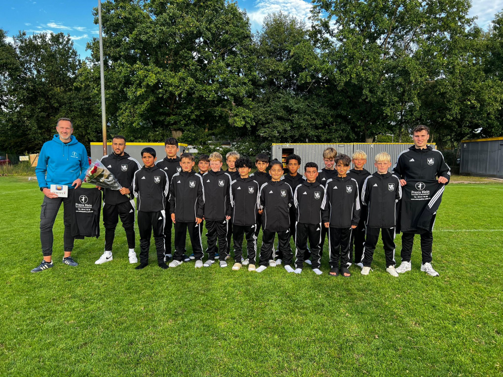 Unsere U14 bedankt sich bei Jürgen Lindhorst (ganz rechts) vom Garten- und Landschaftsbau Lindhorst für die neuen Trainingsanzüge, die im Mai offiziell übergeben wurden.
