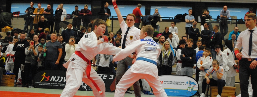 287 Kämpferinnen und Kämpfer aus 44 Vereinen und drei Ländern nahmen am 14.12.2019 beim vorerst letzten X-Mas Turnier in Oldenburg teil. Der VfL Westercelle war dieses Jahr mit fünf Ju-Jutsuka am Start. Isha Njingo begann ihren ersten Kampf, in der Klasse U12 +48 kg, mit schnellen und klaren Schlagkombinationen (Part I) und konnte sofort mit Ippon punkten. Nach einem weiteren kurzen Schlagabtausch war Isha in der Lage ihre Gegnerin mit Osoto-Makikomi (Außendrehwurf) zu werfen, in eine Haltetechnik zu zwingen und den Kampf so vorzeitig mit Full Ippon zu gewinnen. Gegen die nächste Kontrahentin knüpfte Isha nahtlos an die vorherige Leistung an. Nur ein sauberer Wurf wollte dieses Mal nicht gelingen. Dennoch konnte sie immer wieder im Part I und III (Bodenkampf) punkten, gewann mit 7:0 und belegte damit, wie im Vorjahr, den ersten Platz. In der Klasse U10 bis 34 kg startete Andreas Scholl. Seine beiden Vorrundenkämpfe gestaltete Andreas souverän, gewann jeweils mit Full Ippon vorzeitig und zog ins Halbfinale ein. Auch hier ließ er nichts anbrennen. Nach einem erneuten Sieg mit Full Ippon setzte er diese Serie im Finale fort und gewann Gold. Justin Gramlich hatte es in der U14 bis 34 kg gleich im ersten Kampf mit dem schwersten Gegner dieser Klasse zu tun. Nach einem offenen Schlagabtausch und zähem Ringen musste sich Justin dem Dänen leider 6:7 geschlagen geben. Die nächsten Kämpfe waren nicht weniger anstrengend, dennoch konnte Justin die taktischen Vorgaben besser umsetzen, nach Punkten gewinnen und holte so Silber. Zum letzten Mal trat Kristin Raddatz in der Altersklasse U14 bis 57 kg an. Im ersten Kampf tat sich Kristin noch schwer, die taktischen Vorgaben umzusetzen. Zwar konnte sie immer wieder mit Schlagkombination und Aktionen am Boden punkten, doch wollten ihr, gegen die sich heftig wehrende Ju-Jutsuka aus Rottorf, kein Wurf glücken. Am Ende setzte sich Kristin mit 12:6 durch. Den zweiten Kampf begann Kristin wesentlich aggressiver, punktete immer wieder mit Ippon in Part I und am Boden. Nur der entscheidende Wurf zum vorzeitigen Sieg wollte nicht gelingen. Nach zwei erfolglosen Seoi-Nage-Versuchen (Schulterwurf) schaffte sie es, knapp 40 Sekunden vor dem Ende, doch noch mit Tani-Otoshi (Talfallzug) und durfte sich über die Goldmedaille freuen. In der U16 bis 55 kg ging Marc Marx an den Start. Sein erster Kontrahent hatte leichte Reichweitenvorteile, die dieser geschickt zu nutzen wusste. Marc versuchte zwar immer wieder in den Nahkampf zu kommen, um dort seine Stärken im Wurf auszuspielen, musste sich zum Schluss trotzdem nach Punkten geschlagen geben. Im zweiten Vorrundenkampf, gegen einen Niederländer, musste ein Sieg her, um noch in das Halbfinale einzuziehen. Hier konnte sich Marc vor allem am Boden mit Armhebel oder Würgetechniken einen Punktevorteil verschaffen, den er bis zum Schluss clever verwaltete. Im Halbfinale versuchte er im Part I, mit seinem schnellen Gegner aus Norderstedt mitzuhalten, hatte zum Schluss aber einen zu großen Punkterückstand und musste sich mit dem dritten Platz zufriedengeben. Mit drei Goldmedaillen, ein Mal Silber und Bronze belegte der VfL Westercelle in der Vereinswertung den 7. Platz.