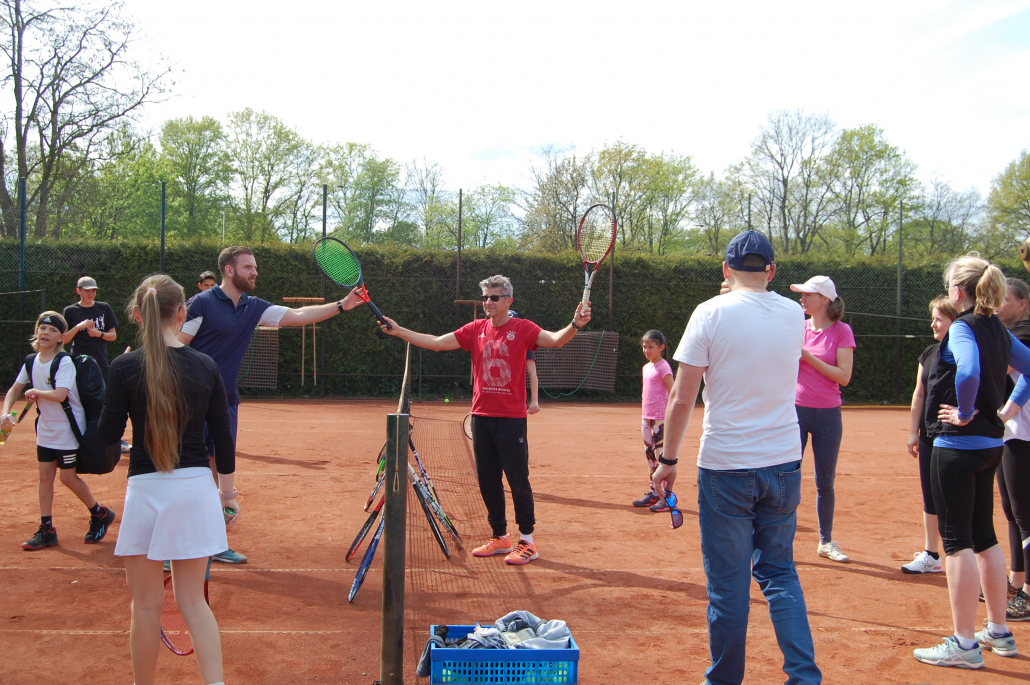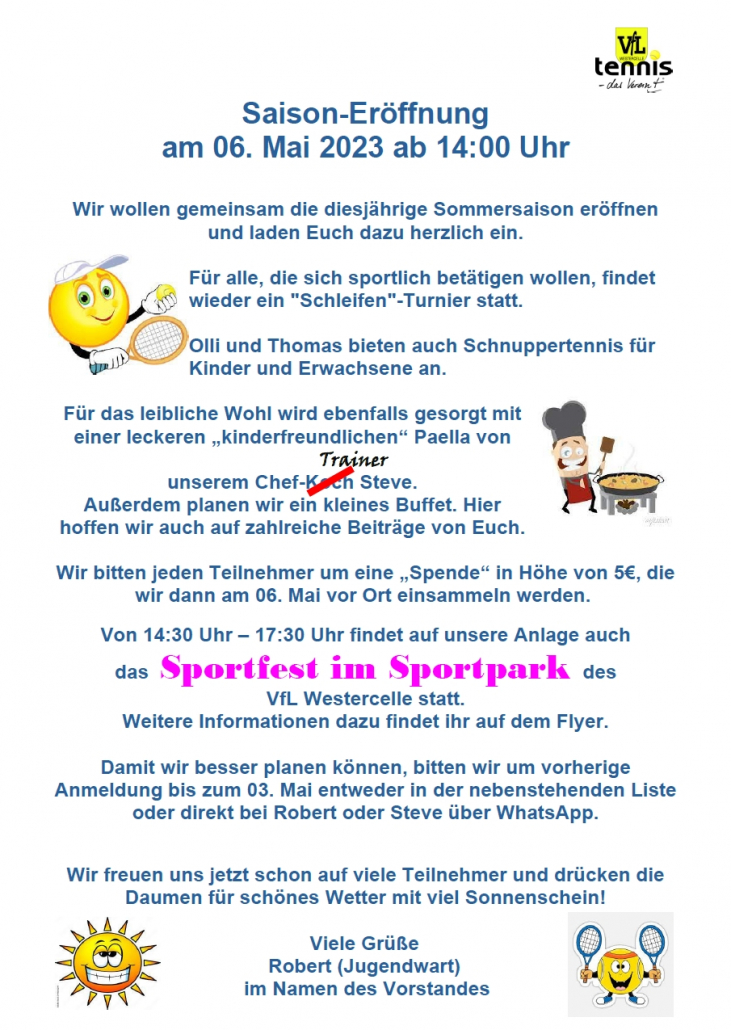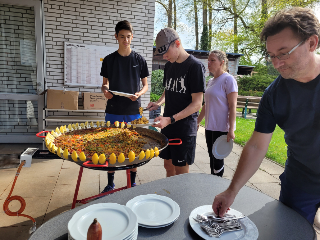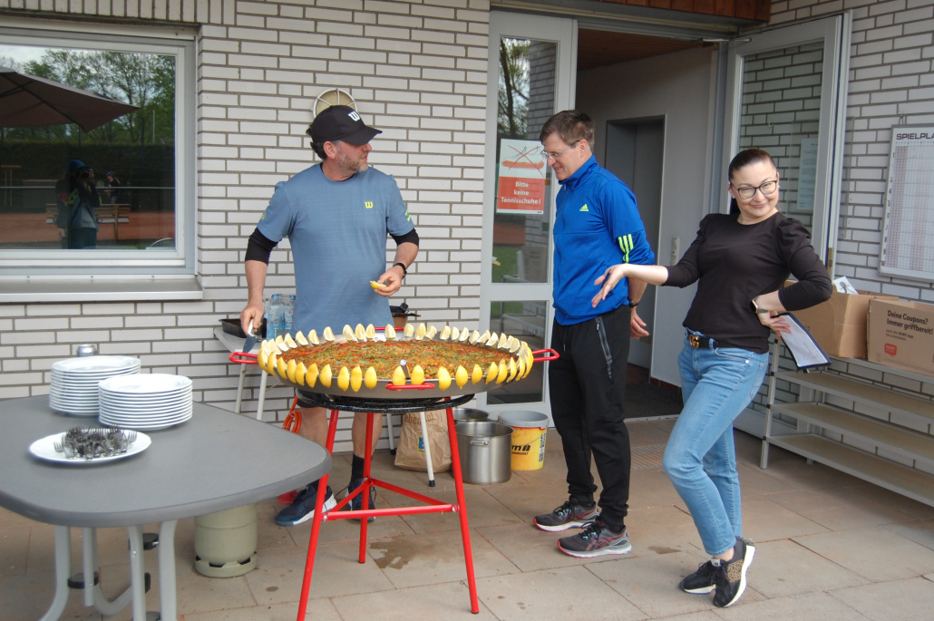 Am 06.05.2023 hat der Verein VfL Westercelle ein großes Sportfest im Sportpark veranstaltet. Alle Sparten des Vereins haben sich mit einem vielfältigen Bewegungsprogramm für Groß und Klein beteiligt. Auf der Tennisanlage war an dem Tag viel los. Mit Schnupper-Tennis auf dem Sandplatz mit Tennis-Coach Oliver Oza, einem Basketball-Programm auf dem grünen Platz und mit Tischtennis und Badminton in der Halle gab es für die zahlreichen Besucher jede Menge Aktionen. Gleichzeitig fand auf der Anlage das Punktspiel der Junioren A statt, wo Timo Knop und Hardy Reimchen die ersten zwei Gewinnpunkte für die Westerceller im Einzel und Doppel erreicht haben. Die Krönung des Tages war die Eröffnung der Freiluftsaison der Tennissparte mit einem traditionellen „Schleifen“-Turnier, organisiert von Tennis-Coach Thomas Masur, in dem Doppel gespielt wird. Dabei spielen Kinder und Erwachsene, Tennisanfänger und erfahrenen Vereinsmitglieder zusammen. Jede Viertelstunde klingelt der Gong, dann bekommen die Gewinner ihre Schleifen. Danach werden die Paare neu zusammengewürfelt. Wer am Ende des Tages die meisten Schleifen hat, hat das Turnier gewonnen. Das Highlight des Nachmittags war die spanische Paella, die der Chefcoach Steve Williams persönlich zubereitet hat wie auch das leckere Salat- und Kuchen-Buffet, welches die Mitglieder gespendet haben. Das Trainerteam freute sich über die gelungene Veranstaltung. Alle Anwesenden waren mit viel Spaß dabei und ließen den Tag mit einem gemütlichen Beisammensein ausklingen.
