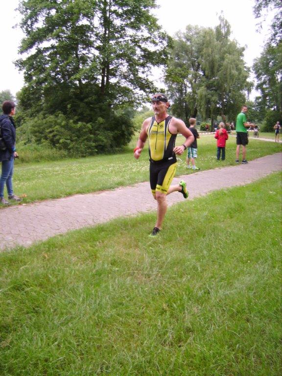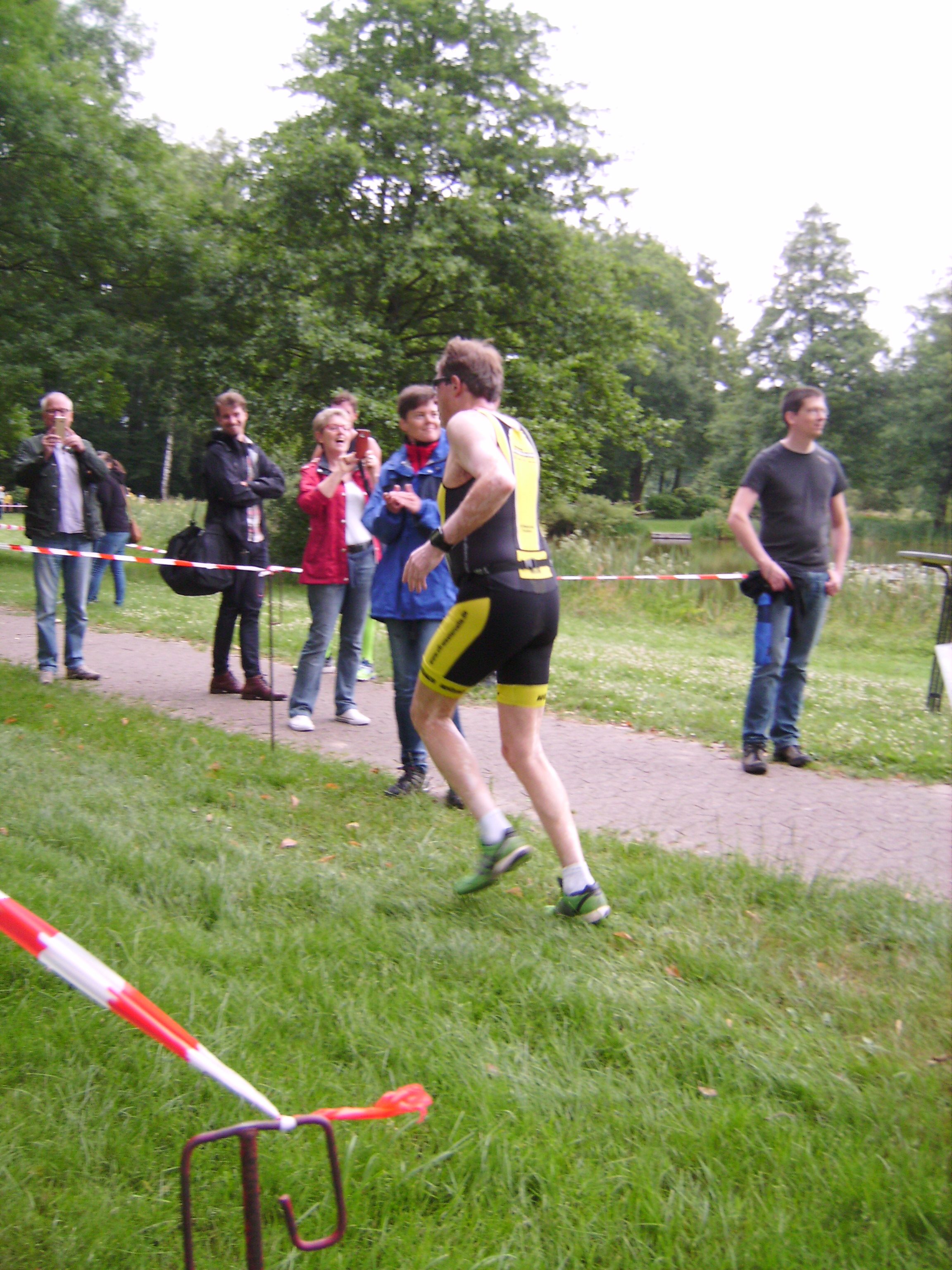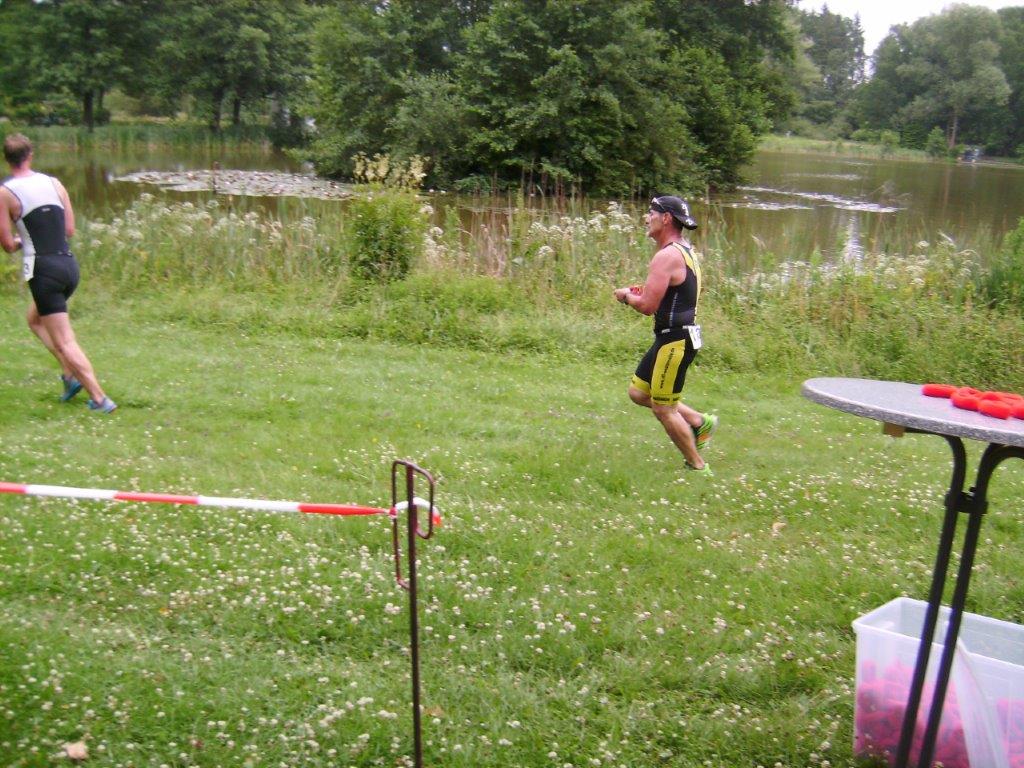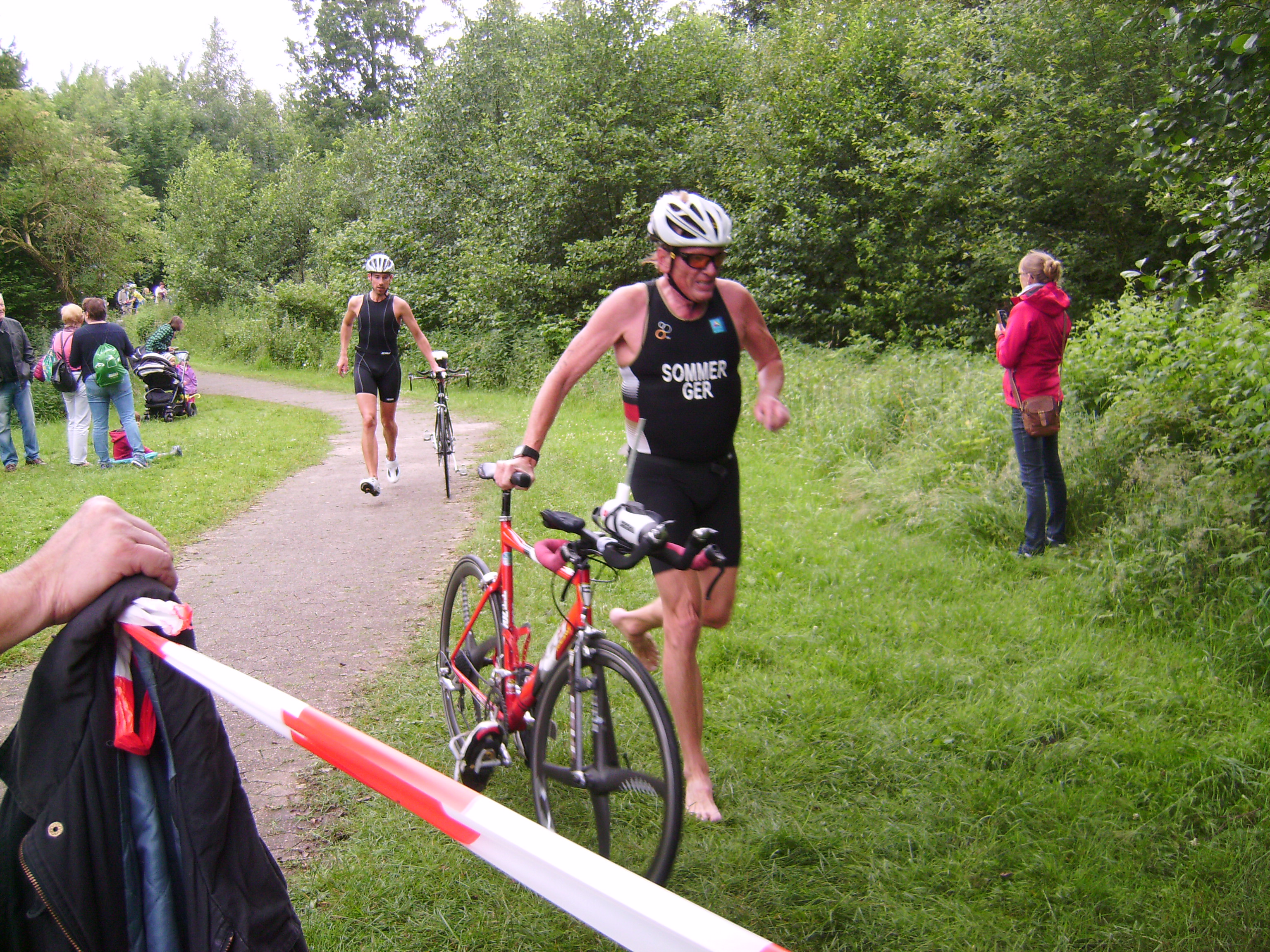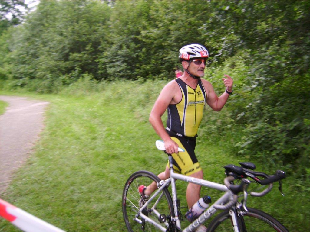 Die ersten 100 Meter gestalteten sich wie so oft für so manch Athleten als recht unruhig, da es bei Positionskämpfen immer wieder zu einigen schmerzhaften Körperkontakten kommen kann, weil im Gewühle diverse Arme und Beine aneinander geraten. Die Athleten vom VfL Westercelle kamen diesmal aber problemlos und ungeschoren in die erste Wechselzone, um sich nach schnellen Wechseln sogleich auf die leicht wellige 23 Kilometer lange Radstrecke zu machen, auf der diesmal ein etwas böiger Wind erschwerend hinzukam. Bereits nach wenigen Kilometern trafen sich die VfL’er Frank Schreiber und Thorsten Lübke erstmals auf dem Bike und nahmen die Verfolgung der schnelleren Schwimmer im Feld jedoch nach kurzer Zusammenfahrt mit unterschiedlichem Tempo auf. Aber auch Gerald Sommer, Volker Dittmar und Dirk Imler waren noch sehr gut im Mittelfeld vertreten.