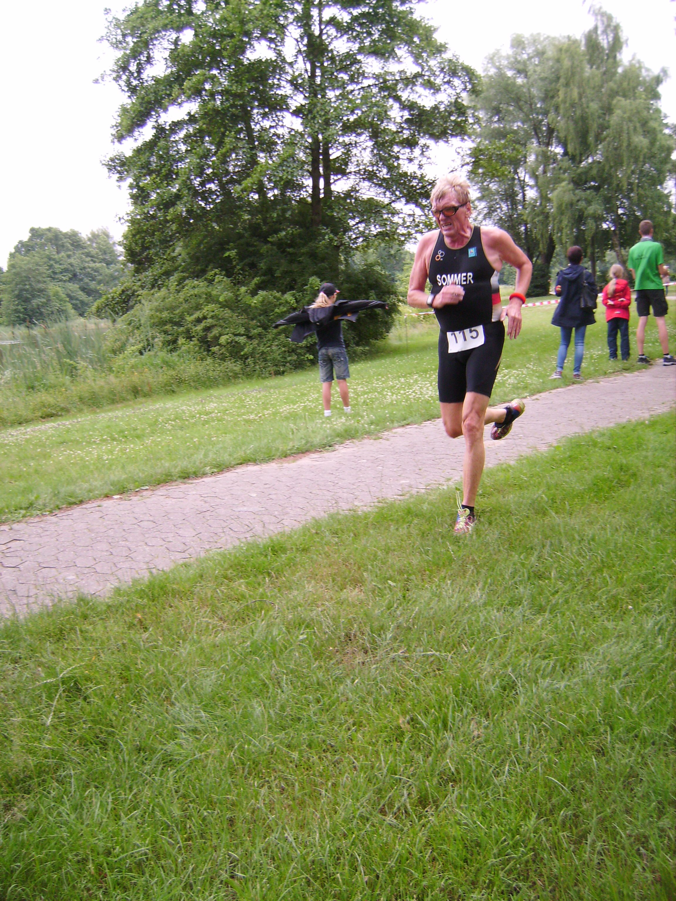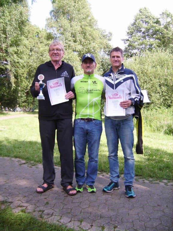 Als erster VfL’er wechselte Lübke auf die Laufstrecke. Dicht gefolgt dann Schreiber, der seinen Teamkollegen jedoch bereits nach gut einem Kilometer ein- und überholte und seinen Vorsprung bis ins Ziel auf 1:15 Minute ausbauen konnte und als schnellster VfL’er mit einer Gesamtzeit von 1:06,46 Std. auf dem 19.Platz der Gesamtwertung einlief, Lübke dann in 1:08,01 Std. auf dem 24.Platz. Sommer lieferte einen sehr guten Wettkampf ab und folgte seinen Teamkollegen gut gelaunt nur wenige Minuten später auf dem 42.Platz in 1:12,23 Std., so dass sich die VfL’er in der Teamwertung immerhin noch den 3.Platz und einen Pokal sichern konnten. Dittmar musste sich aufgrund eines wenige Tage zuvor im Training zugezogenen Muskelfaserrisses im Wettkampf etwas zurückhalten, finishte aber in 1:16,20 Std. souverän und zeigte sich erleichtert, dass die Wade hielt.