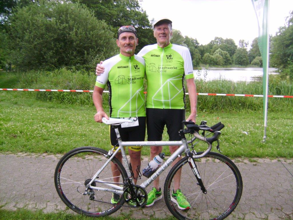 Unser Rookie Dirk Imler, der sich ganz kurzfristig für die erste Teilnahme an einem Triathlon entschied, kam voll begeistert und kaum sichtlich erschöpft nach 1:23,20 Std. ins Ziel. Es wird wohl nicht sein letzter Triathlon gewesen sein und Pläne für weitere Teilnahmen werden bereits geschmiedet. Unsere Super-Senioren von Speßhardt (77 Jahre) und Sachse (75 Jahre) waren in der AK 70 das Maß aller Dinge und sicherten sich den ersten und zweiten Platz ihrer Altersklasse. Mit drei Podestplätzen erzielten die sieben VfL’er eine zufriedenstellende Quote. Als nächster Wettkampf steht nun der AGM-Triathlon in Muster an (22.07.). Hier stehen 500 m Schwimmen, 20 km Radfahren und 5 km Laufen an.