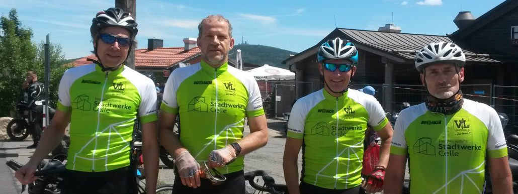 Auch in Corona-Zeiten machte sich eine kleine 4er Gruppe vom VfL Westercelle auf. Los ging es für Knud, Hasko und Thorsten aus Celle und Andreas vom Arendsee in der Früh um 7.30 Uhr, um dann am Treffpunkt vom Parkplatz an der Trabrennbahn in Bad Harzburg gemeinsam eine rund 80 Kilometer Straßentrainingseinheit über Goslar, Kreuzeck, an Hahnenklee vorbei, Lautenthal runter kachelnd und wieder raufkletternd, über Zellerfeld, Oberschulenberg hoch, an der Okertalsperre vorbei, Gemkenthal, dann den finalen 7 km Anstieg ab Altenau zum Torfhaus jeder in seinem Tempo hoch krackselnd. Dann schnell Fotos gemacht und ab ging es die Abfahrt auf der Hauptstraße hinunter mit Tempo 70 km/h plus in Richtung Bad Harzburg zurück. Dort zusammen schnell ein leckeres Eis als kleine Belohnung für die nette Bergfahrttrainingseinheit eingesogen und ab zu den Autos um wieder heimwärts zu fahren. Das Wetter spielte hervorragend mit, fast schon etwas zu warm, daher sehr schweißtreibend. Unangenehm war diesmal leider der teilweise sehr starke Auto- und Motorradverkehr! Aber damit muss man leben und sich drauf einstellen. So fuhren wir lieber etwas defensiver und gingen kein großes Risiko an kurvigen Abfahrten ein und kamen Gott sei Dank ohne Probleme und Zwischenfälle über den Kurs. Allen Teilnehmern hat es wieder riesigen Spaß gemacht, sodass man bereits die nächste gemeinsame Ausfahrt in den Harz ins Auge fasst.