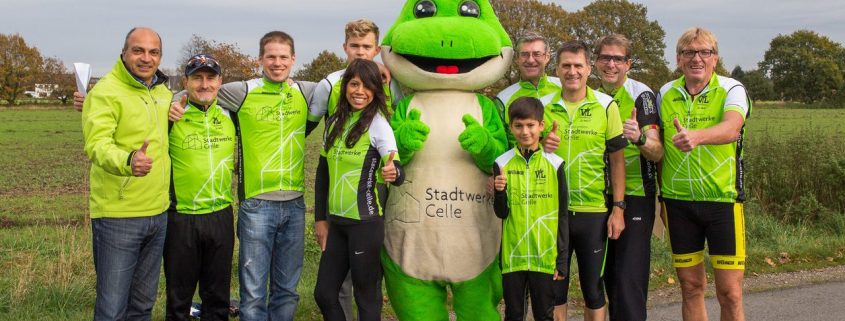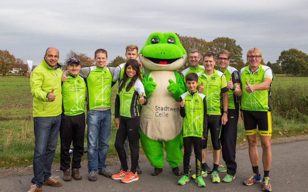 Im Rahmen der 2.Offenen Vereinsmeisterschaft im „Duathlon-Sprint um Zwölf“ war die Freude groß, denn der Geschäftsführer der Stadtwerke Celle GmbH, Herr Thomas Edathy, überreichte den Sportlern des VfL Westercelle ergänzend weitere auffallend hübsche Wettkampfbekleidung (v.l.n.r. auf dem Foto: Thomas Edathy, Thorsten Lübke, Thomas Beckmann, Nadia Schreiber, Paul Andrä, Fiete, Fabian Schreiber, David Simmons, Frank Schreiber, Volker Dittmar und Gerald Sommer).